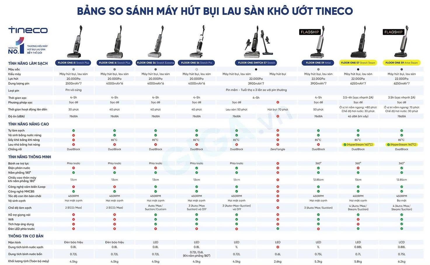Tổng quan về sản phẩm:Máy hút bụi cầm tayDùng pinBộ lọc khô, Con lăn, Đế ạc với bộ chuyển đổi, Dụng cụ vệ inh, Nước lau àn20.000PaHút bụi và Lau nhà(720ml)7 x 2.500 mAh5 giờ30 phút210WTinecoTrung QuốcChi tiết sản phẩm