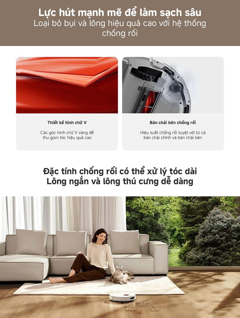 Xiaomi Vacuum H40 sở hữu lực hút lên tới 10.000Pa giúp loại bỏ bụi bẩn, tóc và lông thú cưng dễ dàng, ngay cả với những vết bẩn cứng đầu. Với lực hút mạnh mẽ này, robot có thể hút sạch các mảnh vụn, bụi mịn, giấy vụn, thức ăn rơi vãi và các vết bẩn thông thường mà các robot hút bụi thông thường khó làm sạch. Đặc biệt, công nghệ chống rối của máy giúp làm sạch tóc và lông thú cưng một cách nhẹ nhàng, mà không gặp phải tình trạng tóc bám vào chổi hút, giúp tiết kiệm thời gian và công sức.