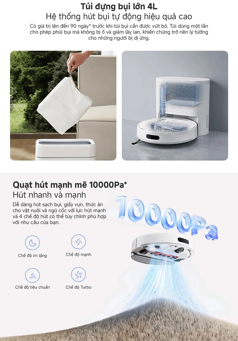 - Lực hút mạnh mẽ 10.000Pa giúp loại bỏ bụi bẩn, tóc và lông thú cưng hiệu quả.