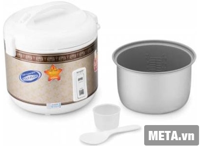 Bao gồm cốc đong và muỗng lấy cơm tiện lợi.