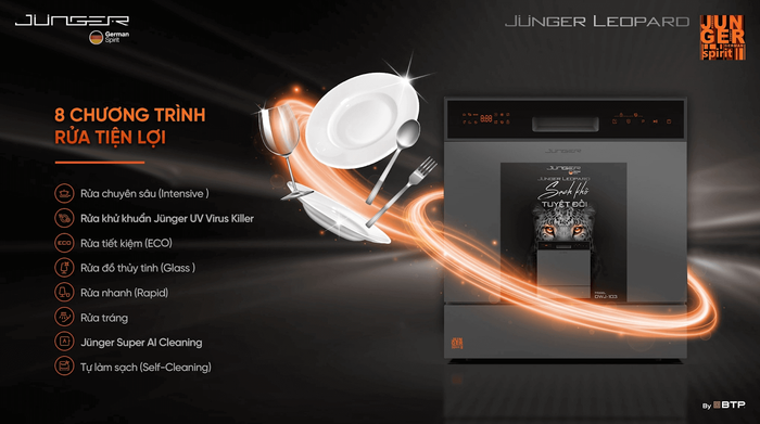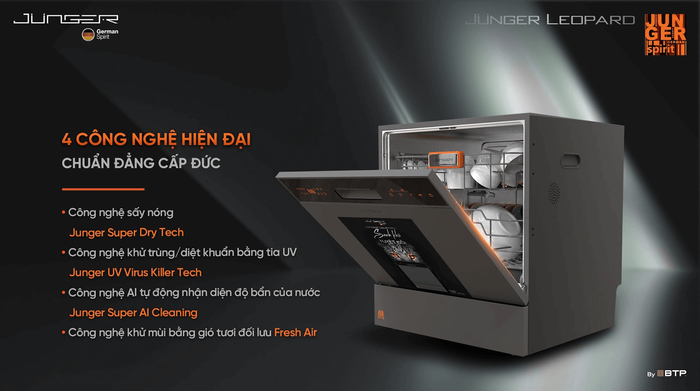 Máy rửa bát Junger Leopard DWJ-100 được ứng dụng 4 công nghệ hiện đại bậc nhất mang lại hiệu quả rửa bát “Sạch khô sáng bóng