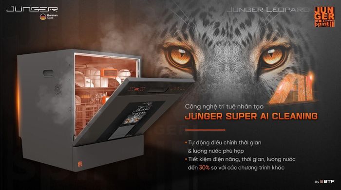 Tính năng rửa thông minh bằng công nghệ trí tuệ nhân tạo “Junger Super AI Cleaning” có thể tự động nhận diện độ bẩn của vật dụng và tự điều chỉnh thời gian và lượng nước rửa phù hợp cho từng mức độ bẩn của bát đĩa, giúp tiết kiệm điện năng, thời gian và lượng nước đến 30% so với các chương trình khác.