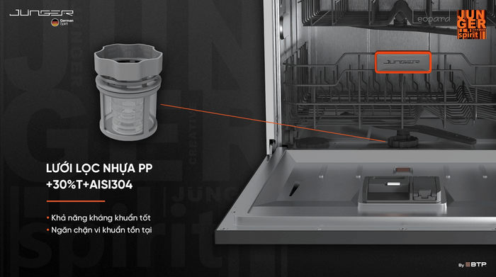 - Rửa khử khuẩn Junger UV Virus Killer: Sử dụng nước nóng 75℃, kết hợp tia UV và khử mùi bằng gió nóng đối lưu Fresh Air tiệt trùng hiệu quả 99,99% vi khuẩn cho bát đĩa và vật dụng rất bẩn.
