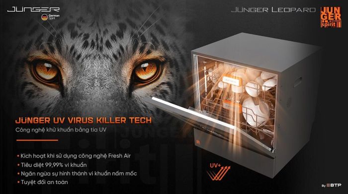Công nghệ này rửa khử khuẩn bằng nước nóng 75℃, tiệt trùng bằng tia UV Virus Killer Tech kết hợp với sấy khô Junger Super Dry và khử mùi bằng gió tươi đối lưu Fresh Air cho khả năng tiêu diệt đến 99,99% vi khuẩn, ngăn chặn sự hình thành vi khuẩn, nấm mốc và ngăn ngừa mùi hôi bám trên bát đĩa, mang đến sự an toàn tuyệt đối cho người sử dụng.