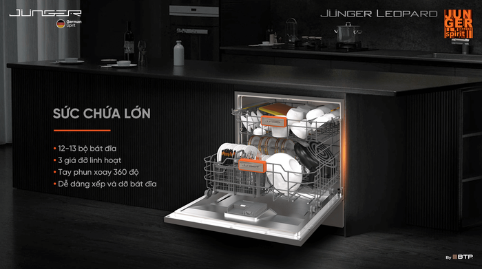 Mỗi lần hoạt động, Junger Leopard DWJ-103 được thiết kế có sức chứa lên tới 12-13 bộ bát đĩa Châu Âu tương đương 3-4 bữa ăn của gia đình Việt. Kèm theo đó là 3 giá đỡ linh hoạt giúp dễ dàng xếp và dỡ bát đĩa trong quá trình sử dụng: