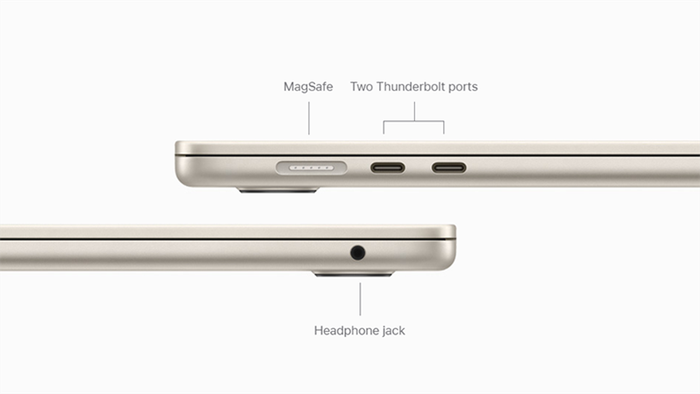 Macbook Air 15 inch 2023 cũng sẽ sở hữu 1 cổng sạc Magsafe, 2 cổng Thunderbolt, 1 jack 3.5 để cắm tai nghe tương tự như thế hệ Mac Air 2022 trước đó nhưng được cải tiến về mặt thông số và tốc độ truyền.