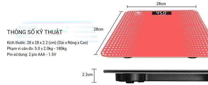Tổng quan về sản phẩm:Cân điện tửCamLEDKính chịu lựcCân trọng lượng cơ thểCân nặng180kg± 100g2 pin AAA28cm x 28cm x 2.2cm28.5cm x 29cm x 3.3cm1,2kgChi tiết sản phẩm