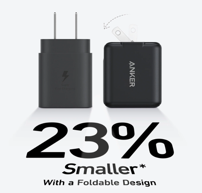 Nhỏ hơn 23% so với bộ sạc USB-C 25W ban đầu, thiết kế gập lại giúp tiết kiệm không gian và dễ dàng mang theo.