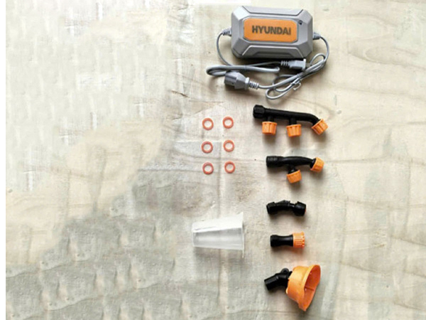 Đầy đủ phụ kiện như cục sạc, cần rút inox, tay bóp, và nhiều éc phun khác nhau.